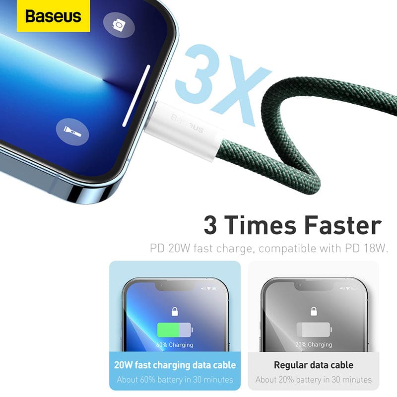 إذا كنت تبحث عن شاحن سريع و عملي لهاتفك الآيفون، فعليك أن تجرب شاحن BASEUS Dynamic 2 series تايب سي الى ايفون. هذا الكابل يمكنه شحن هاتفك من 0% إلى 60% في غضون 30 دقيقة فقط بفضل دعمه للشحن السريع PD 20 واط.