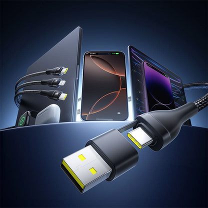 شاحن بيزوس فلاش سيريز 3 كيبل 2 الى 3 شحن سريع يتميز بتصميم إدخال مزدوج يو اس بي وتايب سي مع ثلاثة مخارج تتيح لك شحن هاتفك الآيفون، الآيباد، الماك بوك، سامسونج، هواوي وغيرها من الأجهزة بمنافذ تايب سي و ايفون.